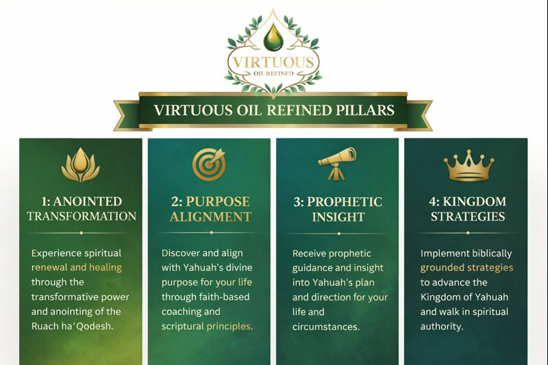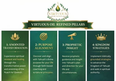 Virtuous Oil Refined is a faith-based consulting and ministry platform dedicated to helping you rise, heal, and walk boldly in your Yahuah-given assignment. Empowering individuals to walk in spiritual clarity, refined purpose, and Holy Spirit-led transformation. It blends biblical wisdom, prophetic insight, and practical strategy to help others rise. It is coaching, consulting, and prayer rooted in biblical wisdom and experience. Empowering Yahuah's daughters and sons through spiritual refinement and holy spirit-led strategy.